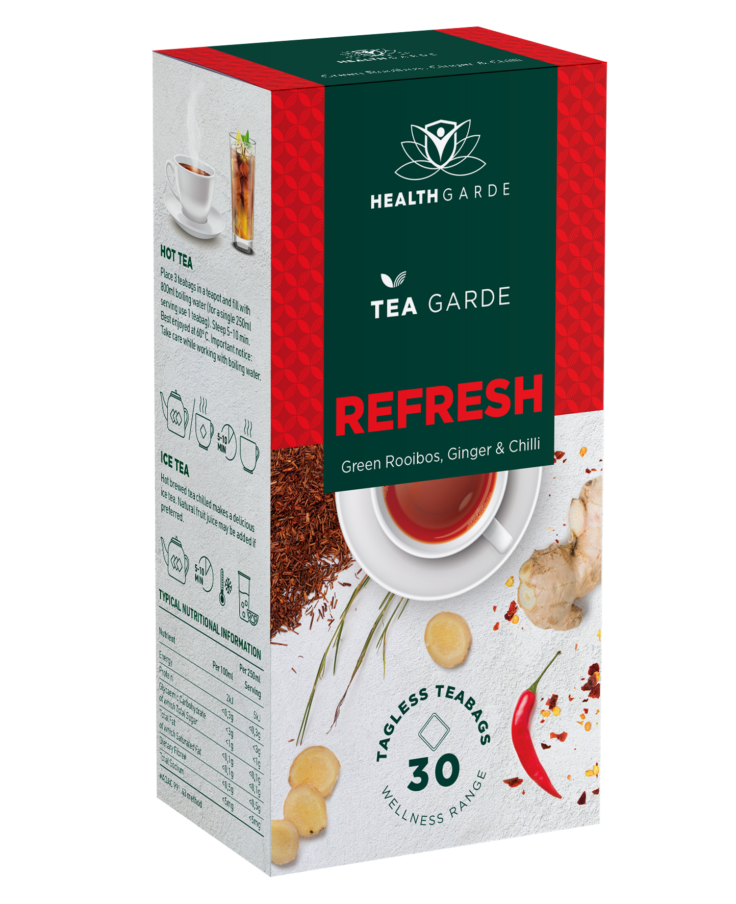Tea Garde Refresh Tea is an invigorating tea blend of anitoxidant rich Green Rooibos and Ginger with a refreshing twist of Chilli.